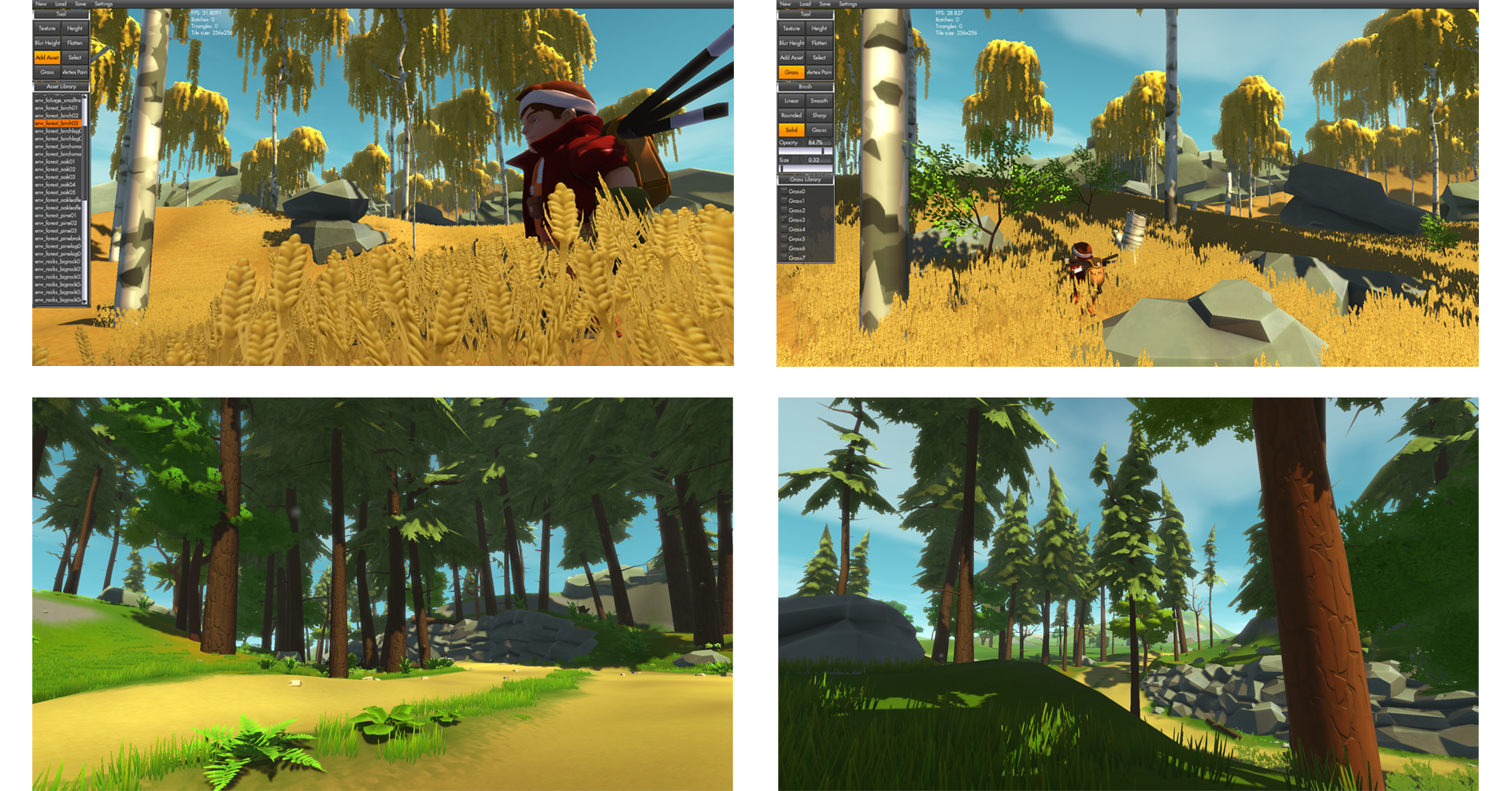 We also added vertex color support to our terrain editor, meaning we can now paint ground textures in different colors, giving the terrain more color variation. This also means we're able to change the color of any tree and grass: no more single color textures! Now the game will look even better! This'll also be a great feature to have once we release the terrain editor for you guys to use and play around with!