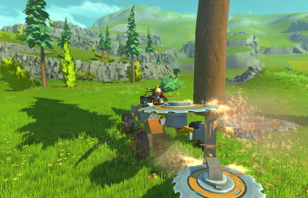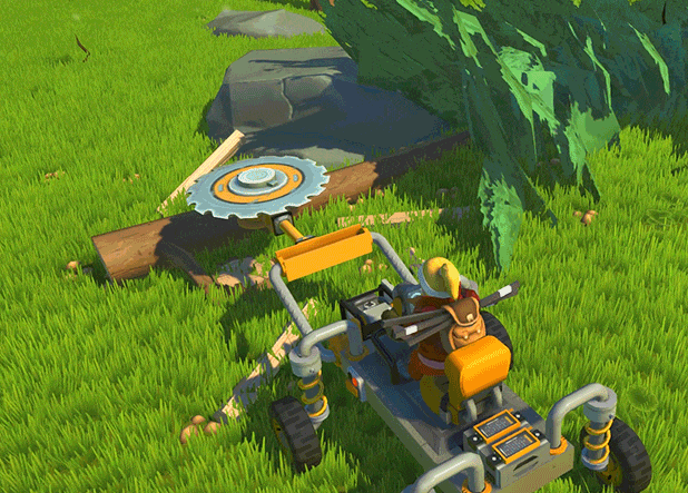 Let's kick things off with a cutting-edge announcement: One of our original goals for Scrap Mechanic was to make tree and rock gathering fun and satisfying - which proved just as difficult as that sounds - while also encouraging creative thinking from players. For example, how best can mechanics prevent the tree they've just chopped down from smashing onto their fancy new creation? How do you then transport that tree to the refinery without the need for a gigantic truck? These are just some of the things Mechanics will have to keep in mind when building your resource gathering vehicle. But none of these vehicles will be complete without the new interactive part, the Saw Blade! Place the Saw Blade on a bearing, crank the engine up to max and aim for a tree or rock to slice it like a pepperoni pizza. It will look a lot better when it's completely done. We also hear that Farmbots are not big fans of these blades... But more on that later!