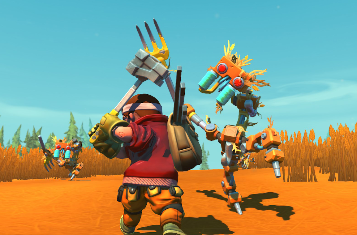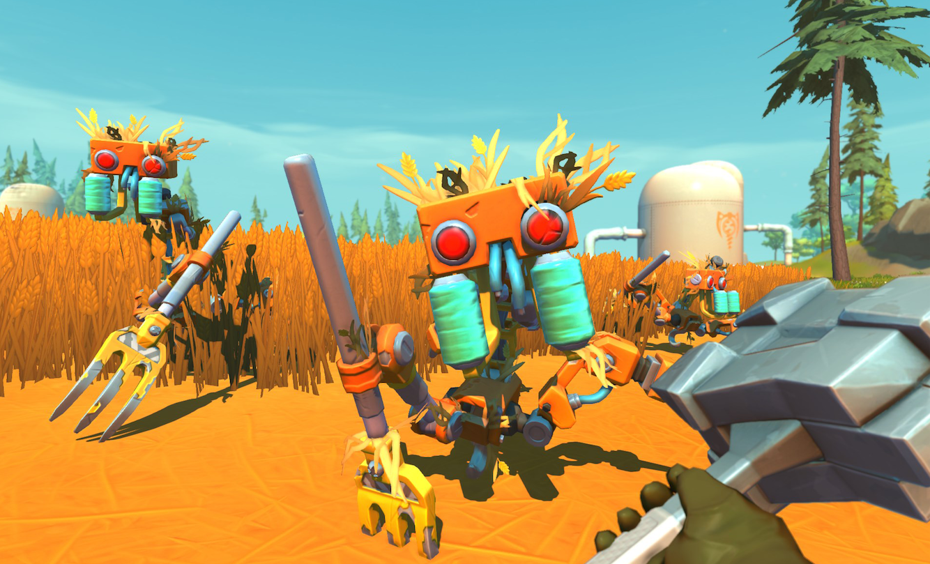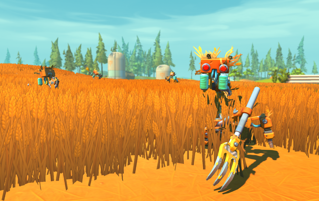 You might recognize parts of this new farmbot from our teaser tweet last week. We are super excited to introduce you to the Haybot for the first time! But don't get too close unprepared since they are very unreliable and dangerous. Originally made to make haystacks and package them in plastic wrap, these Haybots have gone out of control. Now they're often found doing nonsensical things in ruins, like tearing them down and filling them with hay. The Haybot would best be described as the "Zombie" of Farmbots.