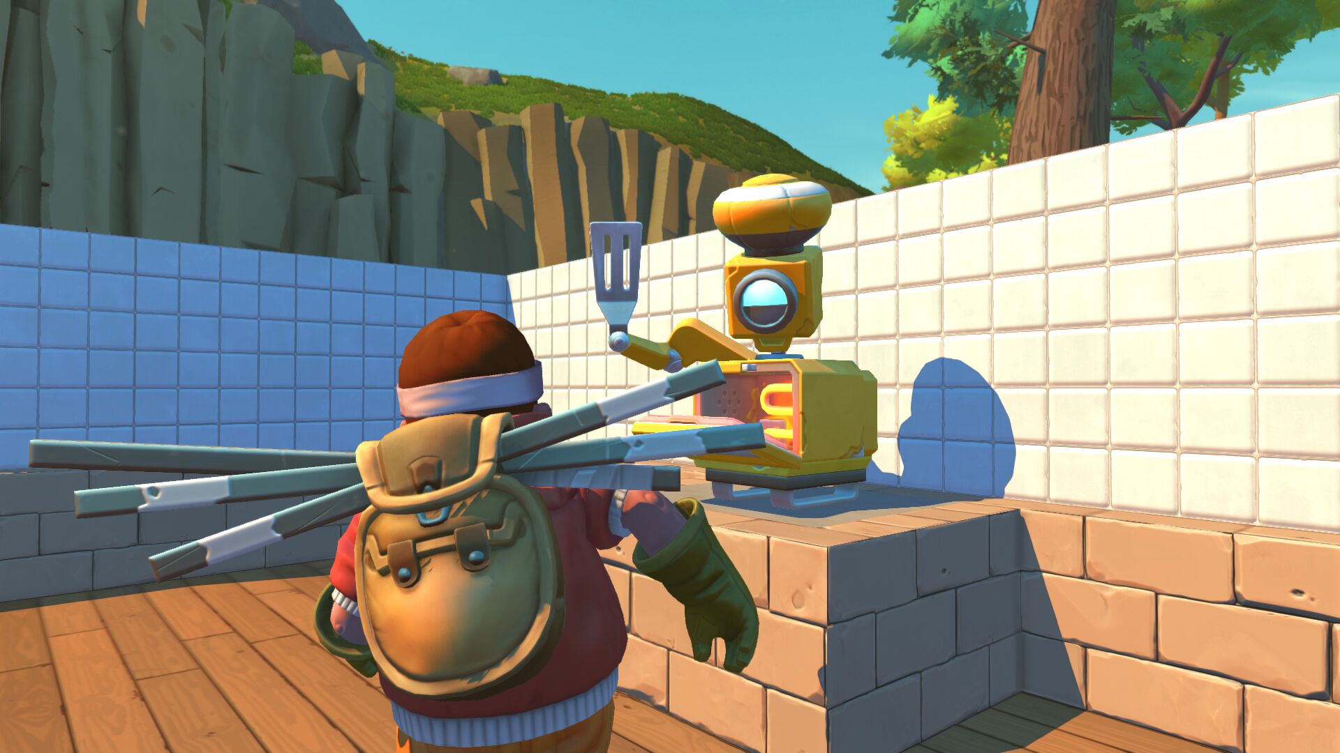 Is anyone else feeling hungry? Then you'll enjoy our next invention... In our last Devblog we showed you some early concepts of the Cookbot - and here he is in the game! This amazing mechanical cook will help you whip up tasty food in no time, which will in turn help keep your health up and also the health of any friends who might need a revive. We're sure you can't wait to sink your teeth into every Scrap Mechanic's favorite food, a delicious pizza burger!