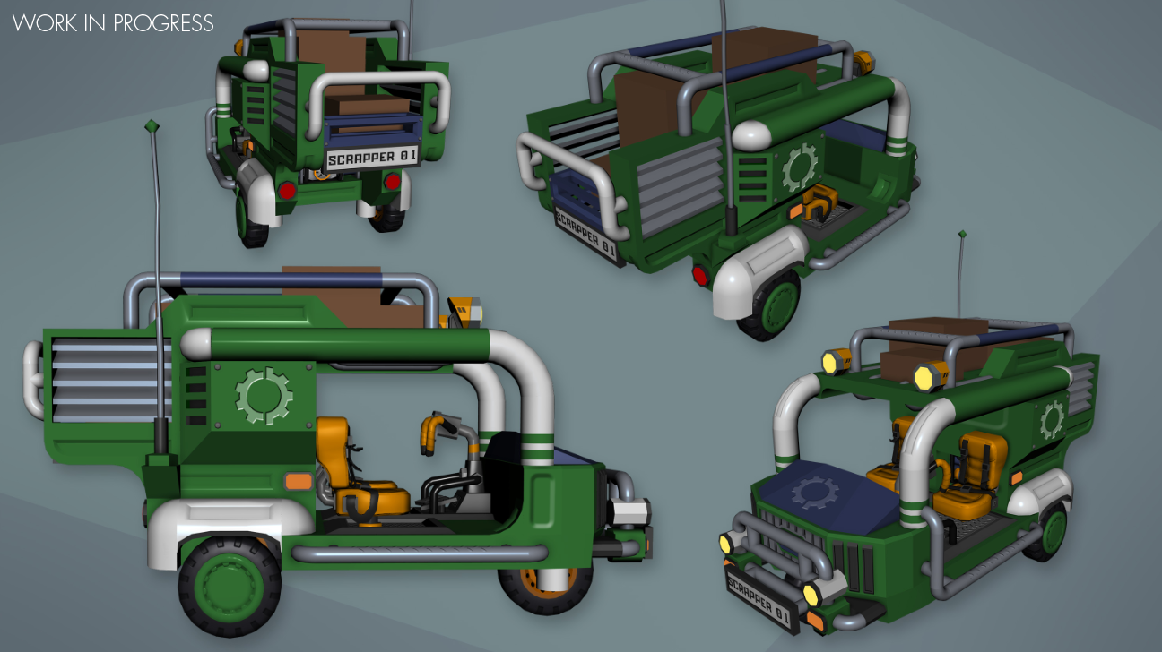 We're working on vehicles that were left behind by the farmers who used to populate the planet. You'll eventually be able to find them spread out on the survival map, ready to be used as they are, but also a prime source for scrap and parts! Perfect for beginners, or just lazy mechanics on the run! It's not hard to build better, more stable vehicles than these, though. One neat little detail is that they've got detachable rims so you can change the look of your wheels! As you can see, we sketch a lot when we're in the design phase, just to be sure things are thought out and neat!